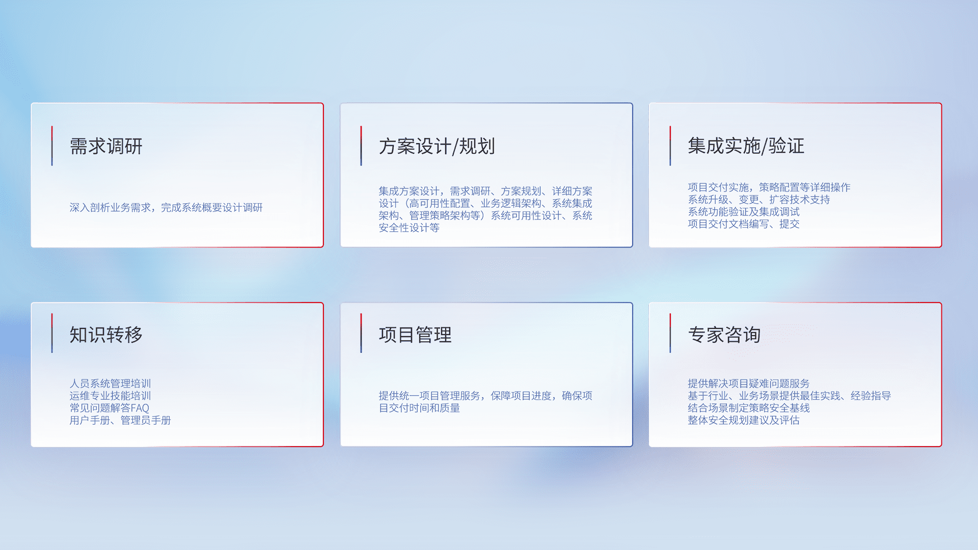针对客户行业特性,,将宏观的安全战略和需求,,通过专业的交付服务,,,,实现项目落地,,,,为客户提供标准规范的集成交付服务。。